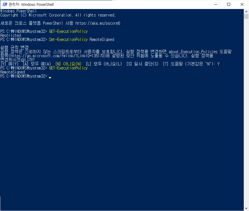 3. RemoteSigned 가 나오지 않으면 Set-ExecutionPolicy RemoteSigned